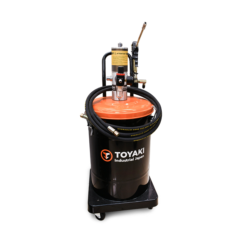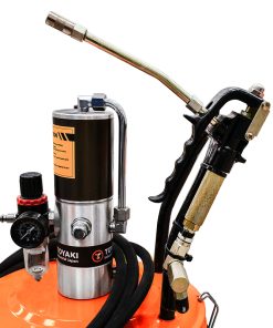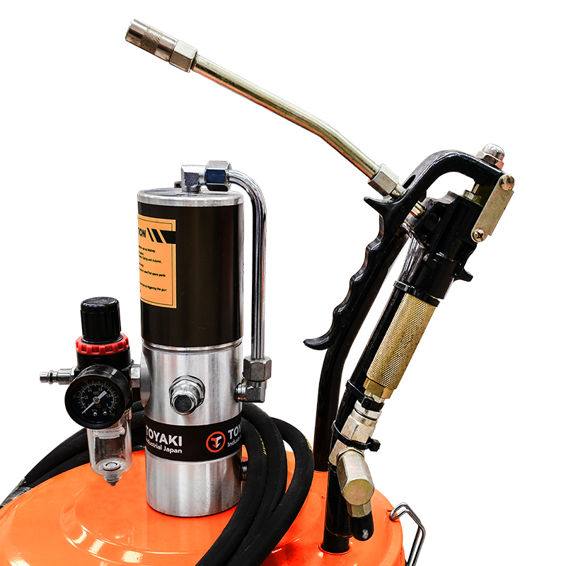 -Para distribuir grasa, presione el botón de la pistola de suministro, el suministro se detiene cuando se suelta el botón, pero todo el sistema permanece bajo presión.