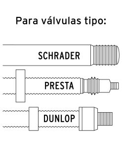 - Cabeza dual que permite el uso de válvulas europea (Presta), americana (Schrader) y Dunlop