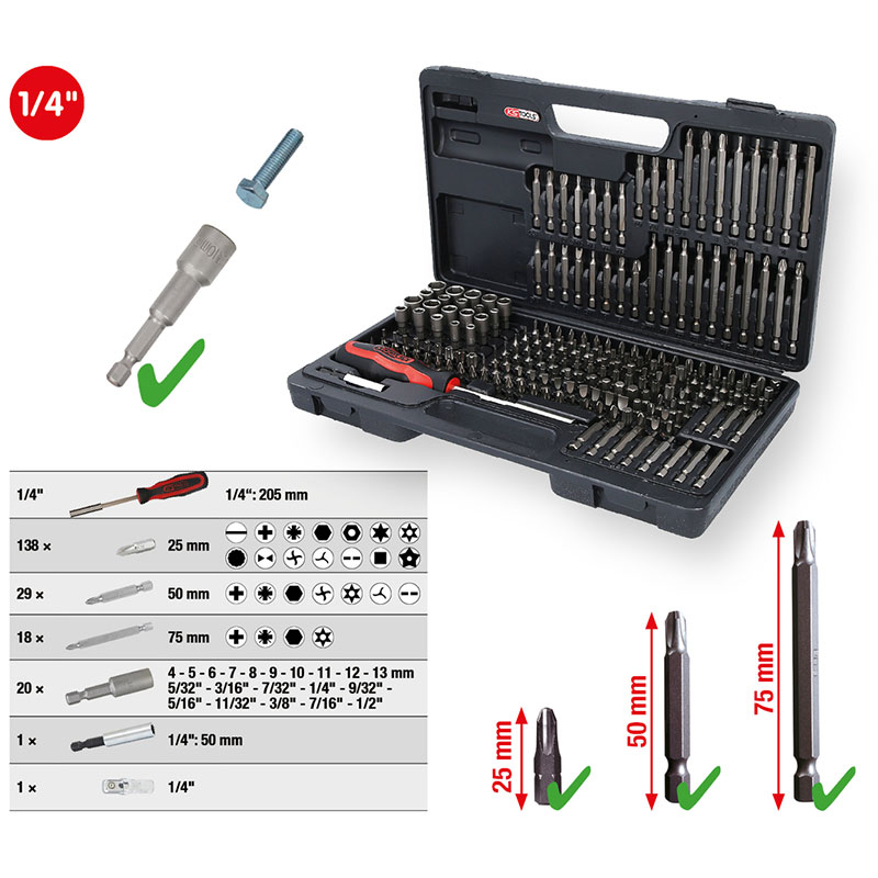 Propiedades generales: – Para atornillador manual y eléctrico; – Incluye portapuntas magnético de cambio rápido y adaptador para puntas de llave de caja de 1/4″; – Con práctico soporte para cinturón; – Ideal y adecuado para trabajos de atornillado domésticos e industriales; – Disposición precisa y organizada de las puntas de 1/4″ más comunes; – Niquelado; – Acero especial para herramientas; – En robusto maletín de plástico.