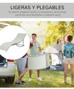 ¿Buscas tumbonas de jardín únicas y cómodas? Prueba estas tumbonas plegables de Outsunny. Su diseño en forma de S proporciona comodidad sin cojines adicionales. Son fáciles de almacenar y perfectas para cualquier lugar. Con estructura de acero y tela transpirable, ofrecen resistencia y confort. Características: Este producto está compuesto por un juego de 2 tumbonas plegables, ideal para que disfrutes de tu tiempo libre en compañía La superficie de reposo tiene un diseño moderno en forma de S, que proporciona comodidad La estructura con marco de acero es resistente y ligera, fácil de mover y transportar Su diseño plegable, facilita su almacenaje y transporte y permite ahorrar espacio cuando no está en uso Con tejido de malla de texteline transpirable, que no re recalienta, ideal para relajarse cómodamente incluso los días más calurosos de verano Bajo mantenimiento y fácil limpieza El diseño curvado de la parte superior de la cabeza proporciona una buena posición de cuello, cabeza y espalda sin necesidad de cojines adicionales No requieren montaje Especificaciones: Color: beige Material: aluminio y texteline (70% plástico, 30% fibra de poliéster) Medidas totales: 165x61x63 cm (LxANxAL) Medidas plegadas: 99x61x21 cm (LxANxAL) Ancho del asiento: 54 cm Altura del asiento: 30 cm Carga máxima: 120 kg Certificaciones: EN581-1-2 Referencia: 84B-540CW El paquete incluye: ● 2 x Tumbonas; ● 1 x Manual de instrucciones