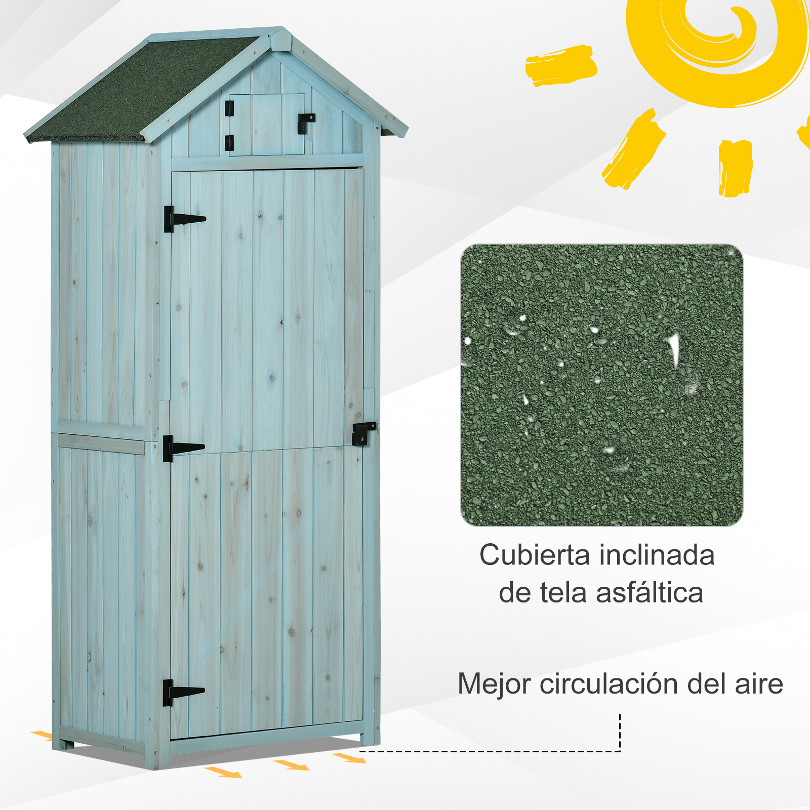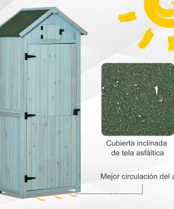 Este mueble de jardín de Outsunny es la solución ideal para organizar todas tus herramientas y equipos de jardinería. Tiene 3 estantes extraíbles a la derecha y la izquierda, sin divisores para artículos más grandes y largos. Fabricado con resistente madera de abeto y techo inclinado con revestimiento asfáltico para proteger tus herramientas y objetos de los elementos. Además, cuenta con una puerta para facilitar el acceso al interior y una pequeña ventana de ventilación en la parte superior. Características: Mueble de jardín con amplio espacio de almacenamiento para tus herramientas de jardinería, herramientas de piscina, entre otras Diseño compacto para adaptarse a espacios pequeños o necesidades de uso específicas Hecho de madera maciza de abeto duradera, ideal para uso a largo plazo Interior compuesto por 3 estantes extraíbles a la derecha, y la izquierda sin divisiones para objetos más grandes y largos El techo asfáltico impide que el agua penetre en el interior y se acumule Puerta de fácil acceso y con cerradura de seguridad Especificaciones: Color: azul claro, verde Material: madera de abeto Medidas totales: 77×54,2×179 cm (LxANxAL) Altura del alero: 153 cm Medidas interiores: 63x41x136 cm (LxANxAL) Medidas del estante: 28×24 cm (LxAN) Altura entre estantes: 34 cm Carga máxima: 40 kg (total) y 6 kg (cada estante) Referencia: 845-209V01BU El paquete incluye: ● 1 x Armario de jardín; ● 1 x Manual de instrucciones