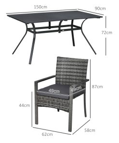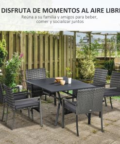 Añade un toque elegante y funcional a tu espacio exterior con este conjunto de comedor de 7 piezas de Outsunny. Incluye una elegante mesa y 6 sillas a conjunto que te permitirán reunirte con toda la familia para comer relajadamente al aire libre. Fabricado con una robusta estructura de acero y diseñado en ratán PE, estos muebles de exterior ofrecen gran resistencia en la intemperie a lo largo de los años. Características: Conjunto de comedor de jardín de siete piezas, adecuado para comidas familiares y para recibir invitados en tu casa Incluye una mesa de comedor y 6 sillas a conjunto para tener espacio de sobras en tus comidas en familia o amigos Fabricado con una robusta estructura de acero y diseño de ratán PE, que garantizan durabilidad a lo largo de los años Las almohadillas antideslizantes en los pies de las sillas ofrecen gran estabilidad, mejorando la seguridad y protegiendo el suelo de arañazos Requiere montaje con dos personas durante dos horas aproximadamente Especificaciones: Color: gris mixto, gris Materiales: acero, ratán PE, poliéster Medidas de la mesa: 150x90x72 cm (LxANxAL) Medidas de cada silla: 58x62x87 cm (LxANxAL) Medidas del asiento: 49×49 cm (LxAN) Altura del asiento: 44 cm Medidas del respaldo: 46x49x45 cm (LxANxAL) Tamaño del cojín del asiento: 49x49x5 cm (LxANxAL) Carga máxima: 120 kg (cada silla), 70 kg (mesa) Referencia: 861-092V00GY El paquete incluye: ● 6 x Silla; ● 1 x Mesa; ● 6 x Cojín de asiento; ● 1 x Manual de instrucciones