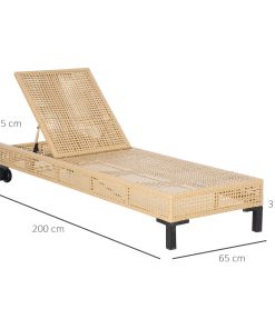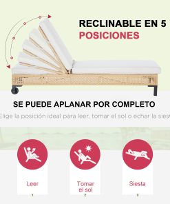 Outsunny Tumbona de Ratán Sintético Chaise Longue con Respaldo Ajustable en 5 Posiciones Cojín Acolchado y 2 Ruedas para Jardín Terraza Acero 200x65x31 cm Natural y Beige
