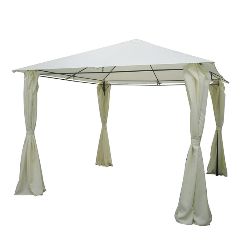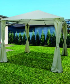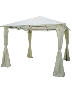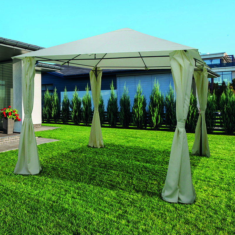 Los laterales de la pérgola incluyen cortinas de poliéster, lo que te permite crear un cerramiento completo para mayor privacidad y protección adicional frente al viento o la luz solar directa. -