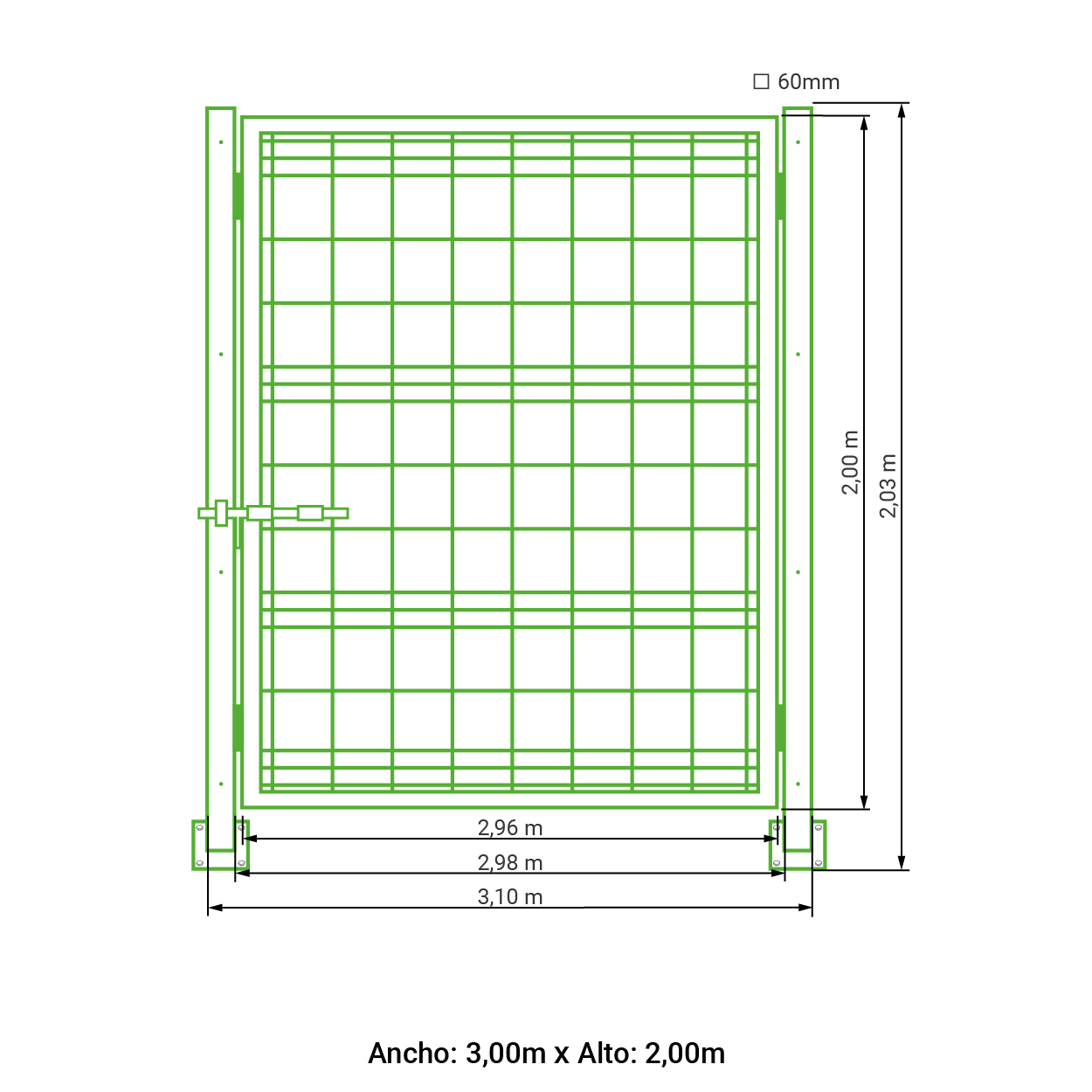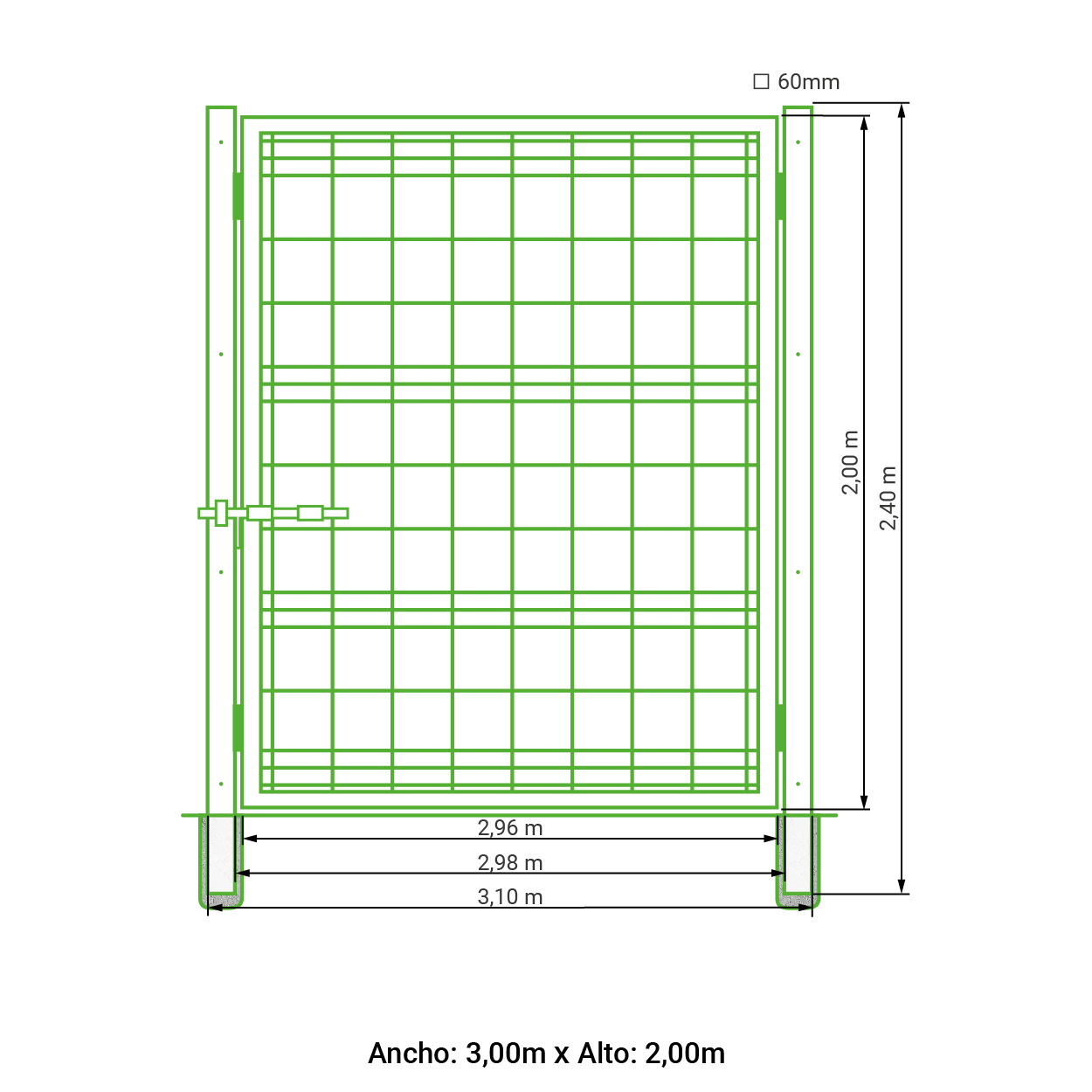 Puerta vehicular 2 hojas para malla simple torsión galvanizada 1,50 metros alto x 4,00 metros ancho